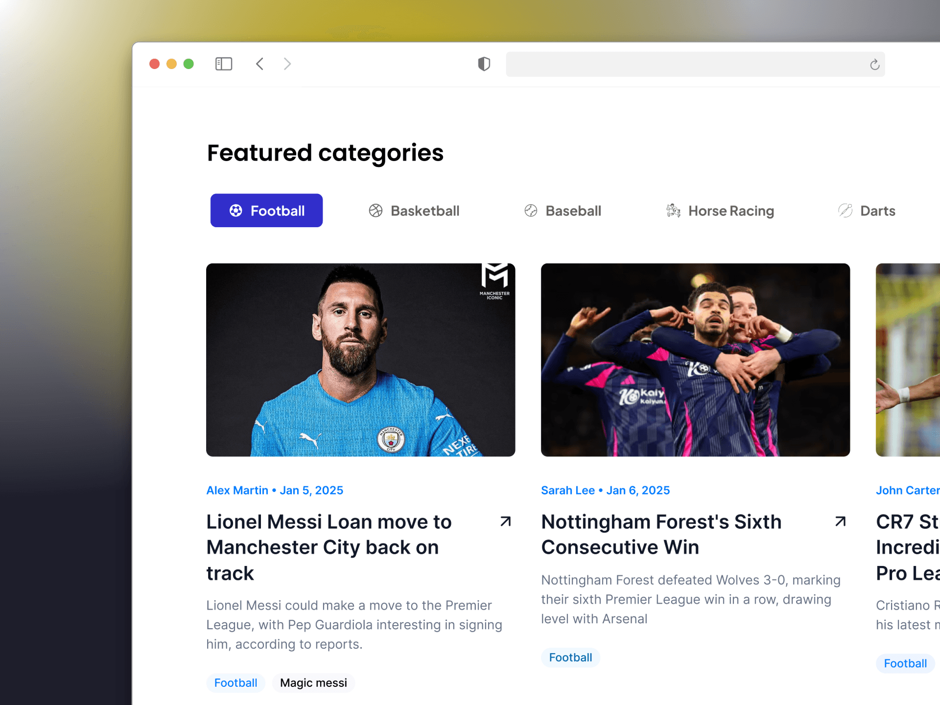 This sports blog design delivers a clean and energetic reading experience for fans, combining bold imagery with structured content layouts and intuitive navigation. The result is a modern sports media interface built for clarity, speed, and user engagement.